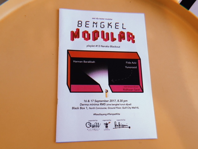 A 14-hour rehearsal over two weeks led to the processing of playlet #13 of Teater Modular: Neraka Blackout by Ridhwan Saidi, performed by Hannan Barakbah, Fida Aziz, and Yunorosid. The Bengkel Modular zine was sold during the showcase on 16 and 17 September 2017 at Black Box 1, Quill City Mall, priced at RM6. / Latihan 14 jam dalam tempoh 2 minggu ke arah pemprosesan playlet #13 Teater Modular: Neraka Blackout oleh Ridhwan Saidi lakonan Hannan Barakbah, Fida Aziz dan Yunorosid. Zine Bengkel Modular telah dijual sewaktu showcase pada 16 & 17 September 2017, di black box 1, Quill City Mall dengan harga RM6.