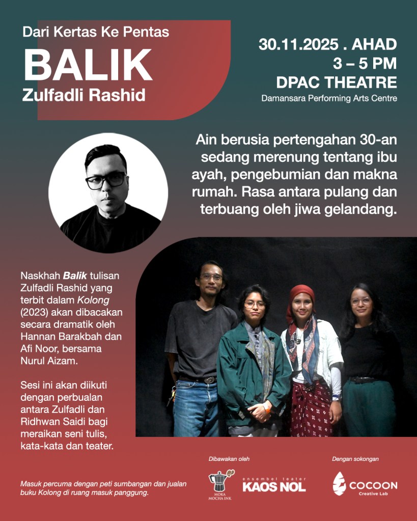 Bacaan dramatik Dari Kertas ke Pentas BALIK tulisan Zulfadli Rashid telah dipersembahkan pada Ahad, 30 November 2025 di DPAC Theatre, Empire Damansara jam 3 petang. Dibacakan oleh Hannan Barakbah dan Afi Noor, bersama Nurul Aizam diikuti sesi bual bicara bersama Zulfadli dan Ridhwan Saidi.