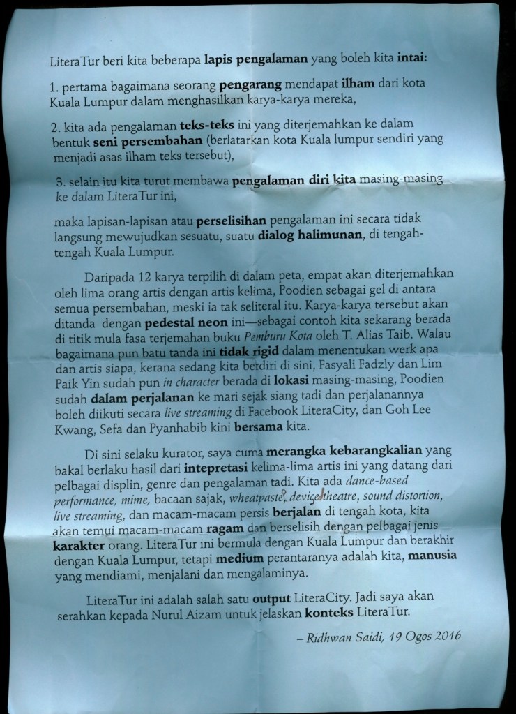 LiteraTur merupakan seni persembahan jalanan yang telah berlangsung pada 20 Ogos 2016. Nota Kurator ini merupakan tulisan ringkas untuk versi laman web. Esei yang lebih komprehensif berjudul ‘LiteraTur: Atau Jalinan Performans Seni Adaptasi Sastera di Jalanan’ terdapat di dalam buku LiteraCity: Fragmen Sastera Kuala Lumpur.