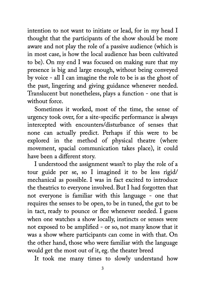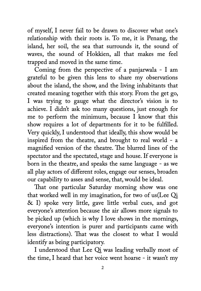 “It is also unlike a city tour, as it does not directly introduce the history of buildings or streets. The director, Ridhwan Saidi, drawing on a profound insight into the historical texture of space (the city), skillfully employs a sound strategy combined with meticulously researched history to create a disorienting experience where different historical ghosts are simultaneously present.“ – Ngo Tjer Hong (full review; also the same writeup in Chinese)