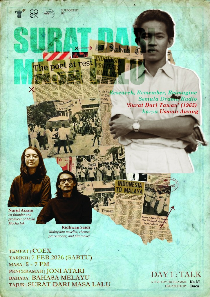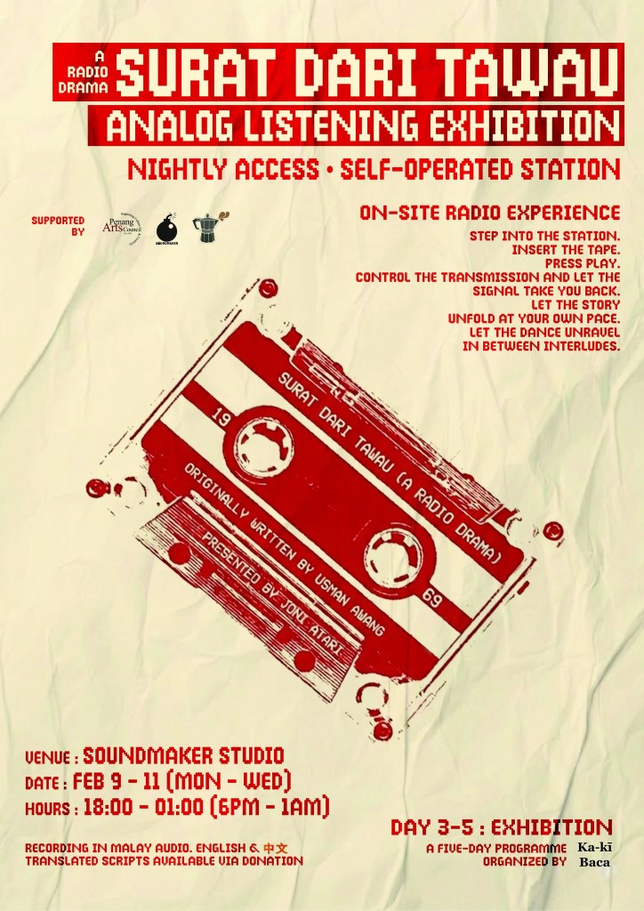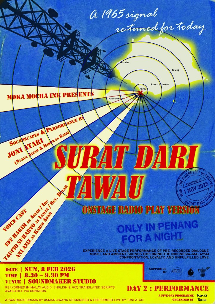 Joni Atari presents the radio drama Surat Dari Tawau by Usman Awang, which explores the Indonesia–Malaysia Confrontation, loyalty, and unfulfilled love. The pre-recorded dialogue, music, and ambient sounds will be performed live.