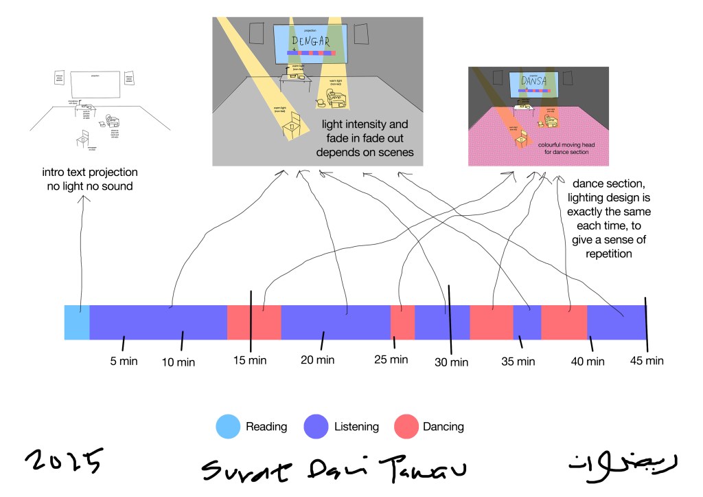 “If music is the soft whispering of the state, then broadcasting is the nervous center of the state. In the era when television was not yet widespread, broadcasting was not only a tool for information transmission but also a monopolistic machine for the state to define reality. Joni Atari’s “reimagining” of Usman Awang’s radio drama published in 1969, Surat Dari Tawau, did not choose a simple replica reproduction, but in the theatre space of 2025, coordinating with the era sounds and background narratives of the 60s, provided modern audiences with an auditory dislocation experience.” – Ngo Tjer Hong, Inheriting the Rupture: Reconstructing “Us” amidst Myths, Archives, and Ghosts— Discursive Essay and Over-interpretations on the What the Elders Left Us Festival 2025 / Chinese: 斷裂的繼承:在神話、檔案與幽靈之間重構「我們」— — 關於 What the Elders Left Us 藝術節的散論與超譯