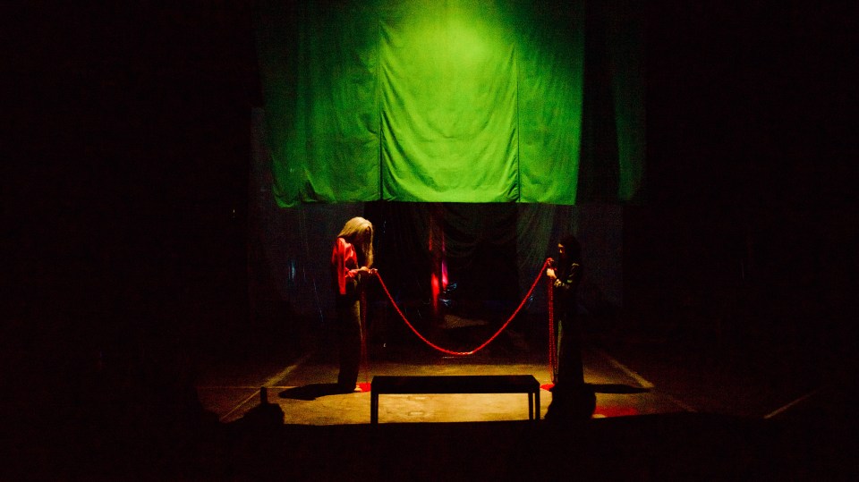 Rehearsals began in several locations but the work started to take its final shape at PKAF (Centre for Film Studies & Appreciation), Alam Budiman. What we practiced in a small, dark room had to be recalibrated in the actual venue. The acoustics and atmosphere of a room were not the same as in a warehouse. In addition to the three actors—Sadiq M. Jamil, Mia Sabrina Mahadir, and Lew Shu Ni—those working behind the scenes included Nurul Aizam, Rashid Akhmal, Amirul Rahman, Tan Cher Kian, Tasha K, and Farid Khir. Together, we set up the performance space. Our set designer, Ilham Sani, works with the philosophy that scenography should be sustainable, lightweight, and minimal. In this case, different kinds of plastic and paper were used to create partition sheets. Sustainability meant that the red paper and plastic used in this play had already been used in earlier productions. The green and transparent sheets of plastic were newly purchased, but they will be reused in future productions. These materials were light and could be rolled up for storage. Waste was minimized in pursuit of zero-waste theatre. / Proses latihan dijalankan di beberapa lokasi pada awalnya tetapi mula mendapat bentuk akhir sewaktu di PKAF (Pusat Kajian & Apresiasi Filem), Alam Budiman. Latihan yang berjalan di dalam ruang kecil dan gelap ini, perlu di-calibrate semula sewaktu di lokasi sebenar. Akustik dan semangat ruang sebuah bilik tidak sama seperti di gudang. Selain tiga orang aktor iaitu Sadiq M. Jamil, Mia Sabrina Mahadir dan Lew Shu Ni, mereka yang terlibat di belakang tabir termasuk Nurul Aizam, Rashid Akhmal, Amirul Rahman, Tan Cher Kian dan Tasha K serta Farid Khir. Kami bersama-sama memasang set di lokasi. Menjadi falsafah Ilham Sani iaitu pereka set kami bahawa sinografi teater perlu sustainable, lightweight dan minimal. Dalam kes ini, beberapa jenis plastik dan kertas digunakan dalam membuat helaian pemisah. Ia sustainable dalam erti kata, kertas dan plastik merah yang digunakan dalam play ini, pernah digunakan di dalam pementasan terdahulu. Helaian plastik hijau dan transparen yang baru dibeli, dan ia bakal digunakan di dalam pementasan-pementasan akan datang. Helaian-helaian kertas dan plastik ini ringan dan boleh digulung untuk disimpan. Sampah diminimakan dalam menuju ke arah produksi teater zero waste.
