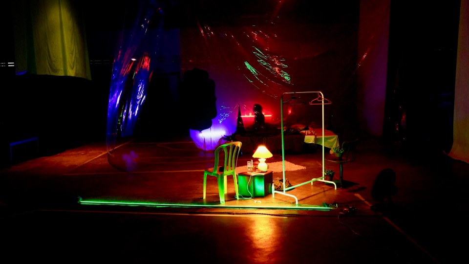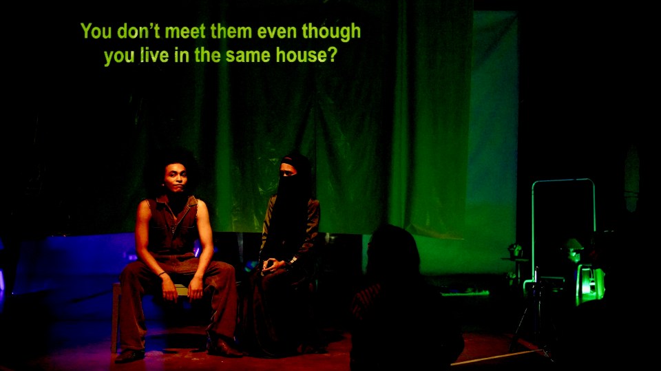 The use of everyday materials like paper and plastic also reflected and refracted light. Since the venue had no special lighting—only basic switches on the walls—the set design indirectly created layers of visual texture. There were solid, transparent, and translucent surfaces. Perspective shifted depending on where one stood or sat. Standing offered a different experience from sitting on a chair, and sitting on a chair differed from sitting on the floor. Distance also mattered. Theatre is a live, deeply personal encounter, unlike the proscenium stage where images are arranged for the audience to view from afar. Teater Normcore: Masam Manis invited audiences to zoom in and zoom out, to immerse themselves in the intimacy of a room or to step back and observe from a distance. Each experience was unique to each person. / Penggunaan objek seharian seperti kertas dan plastik juga memantul dan membiaskan cahaya. Oleh kerana ruang ini tiada lampu istimewa, yang ada cuma lampu-lampu asas yang dikawal pada suis dinding, rekaan set secara tidak langsung memberikan lapisan-lapisan visual yang indah. Ada lapisan solid, transparent, dan translucent. Perspektif berubah untuk setiap posisi yang dipilih. Melihat secara berdiri berbeza pengalamannya berbanding melihat secara duduk di kerusi, dan duduk di kerusi berbeza dengan duduk di atas lantai. Jarak juga main peranan. Teater adalah pengalaman langsung yang amat peribadi. Tidak seperti teater proscenium di mana audiens melihat susunan imej dari jauh. Teater Normcore: Masam Manis menawarkan audiens untuk zoom in dan zoom out, untuk immerse ke dalam kisah di dalam bilik atau menjarakkan diri untuk perhati dari jauh. Setiap pengalaman unik untuk diri masing-masing.